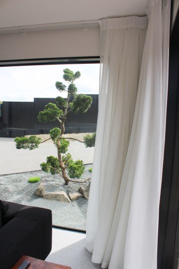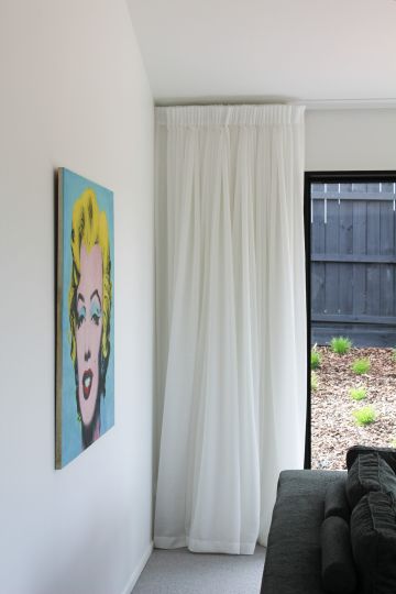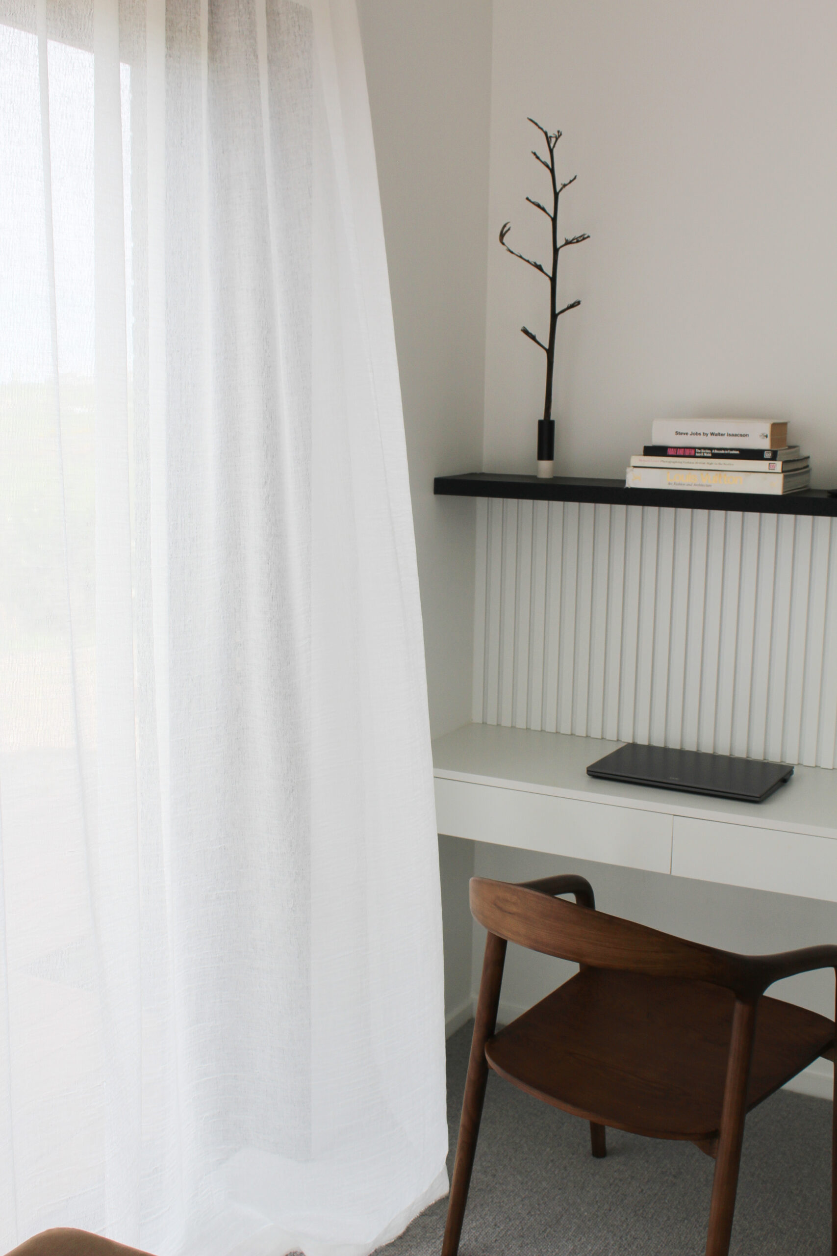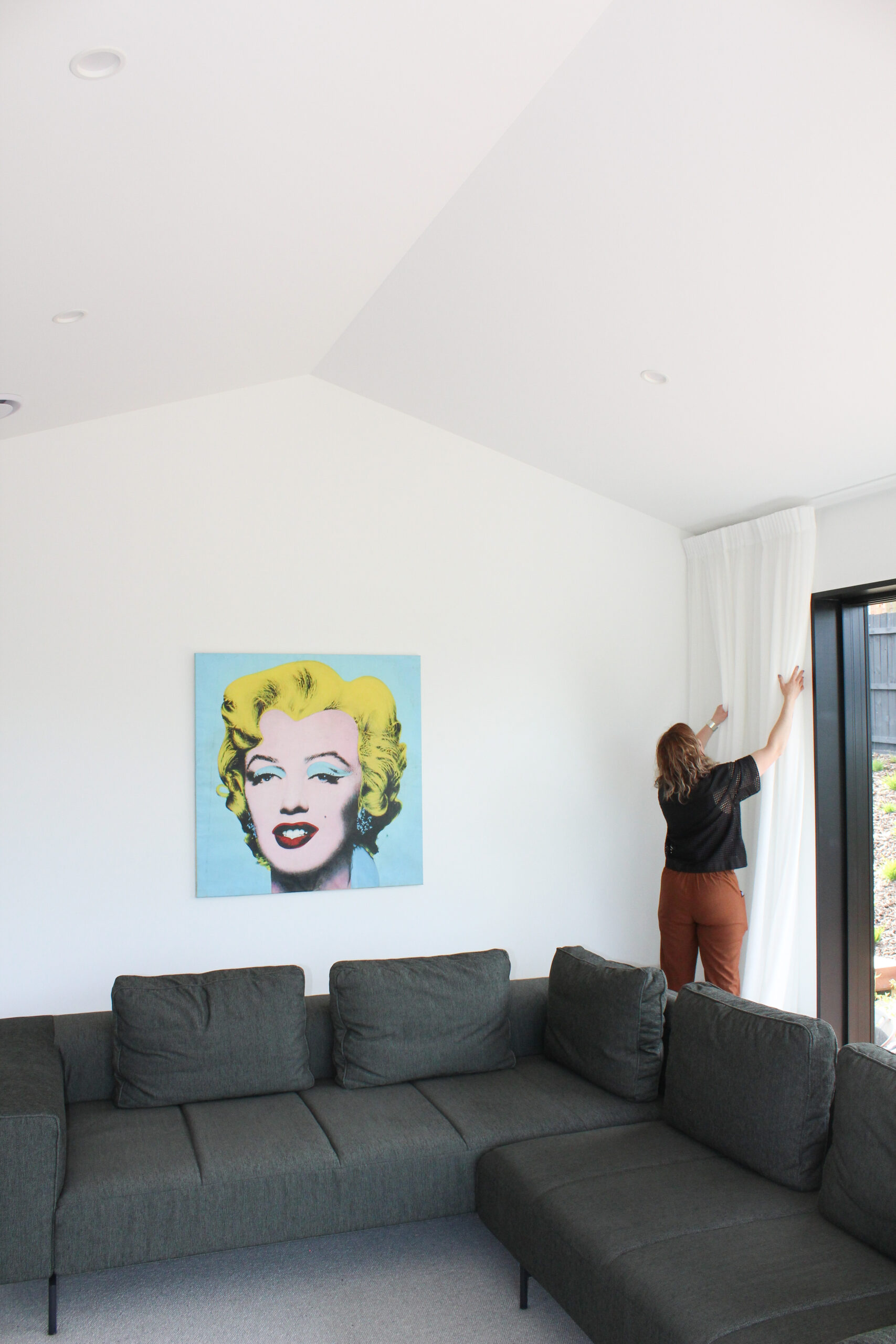 Designed for a young family, this new build embraces a minimal colour palette, executed with precision and intent. Crisp whites were selected for key backdrop elements – paint finishes and curtains, while the flooring was kept as light as possible to enhance the home’s sense of space and airiness.