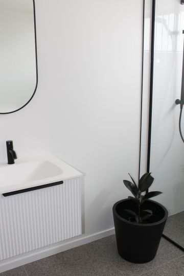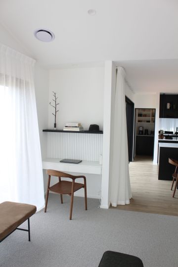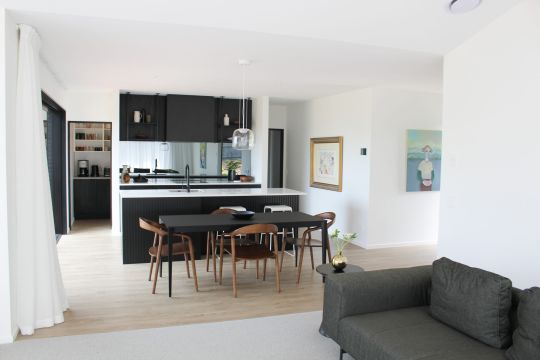 This restrained foundation allows the darker elements to take center stage. Bold cabinetry, furniture and joinery introduce depth and contrast, creating visual interest without overwhelming the interior. The interplay between light and dark is deliberate and balanced, resulting in a modern, contemporary home that feels calm yet assured.